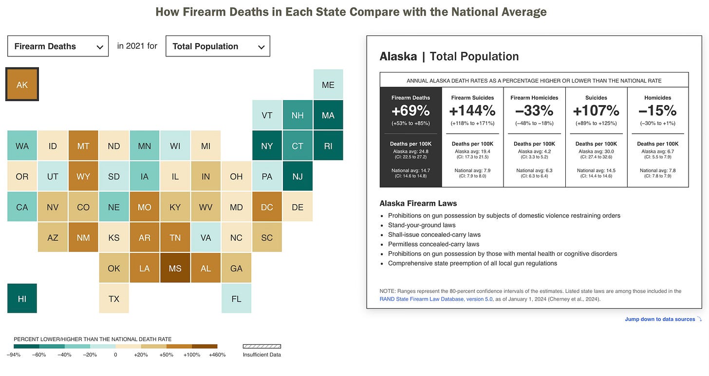 When all firearm fatalities are combined, Alaska ranks among the worst, with a firearm mortality rate (in 2021) that was 69% higher than the national average.