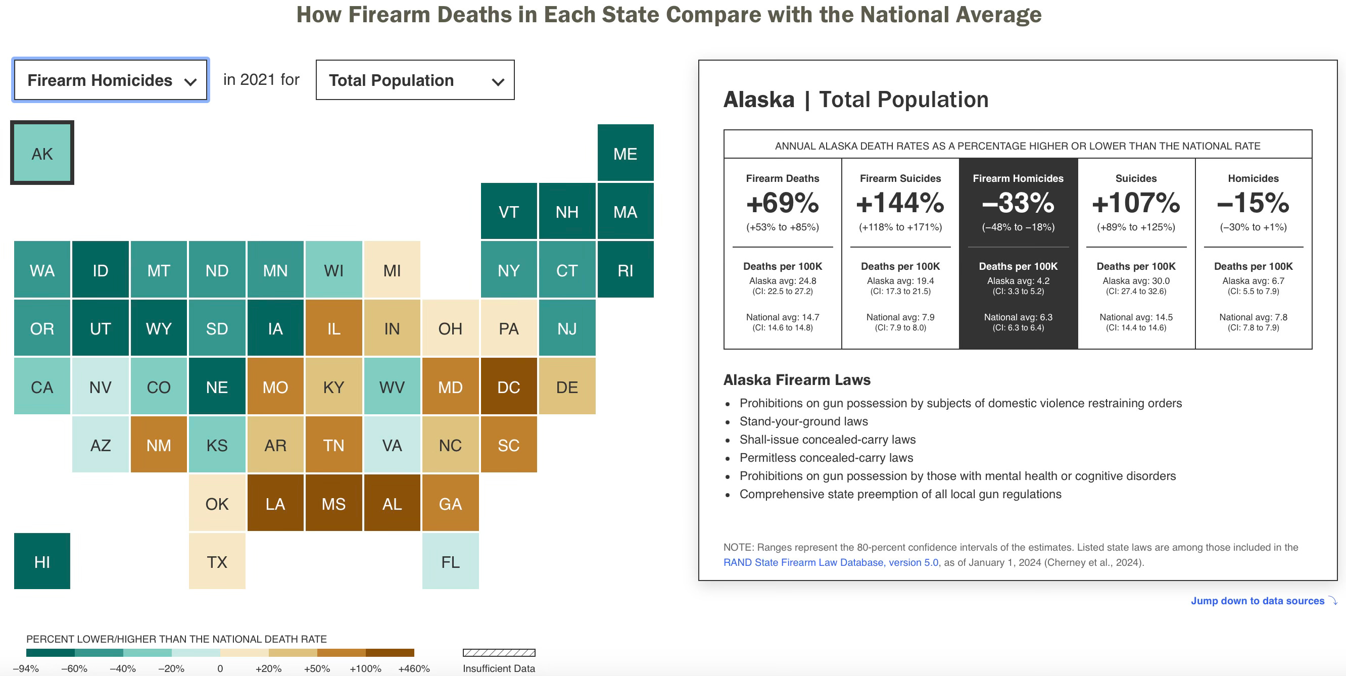 This handy State Firearm Mortality Explorer tool maintained by left-learning policy think tank RAND, shows how each state’s total firearm fatality rate, suicide rate, and homicide rate compares to the national average. Check it out!
