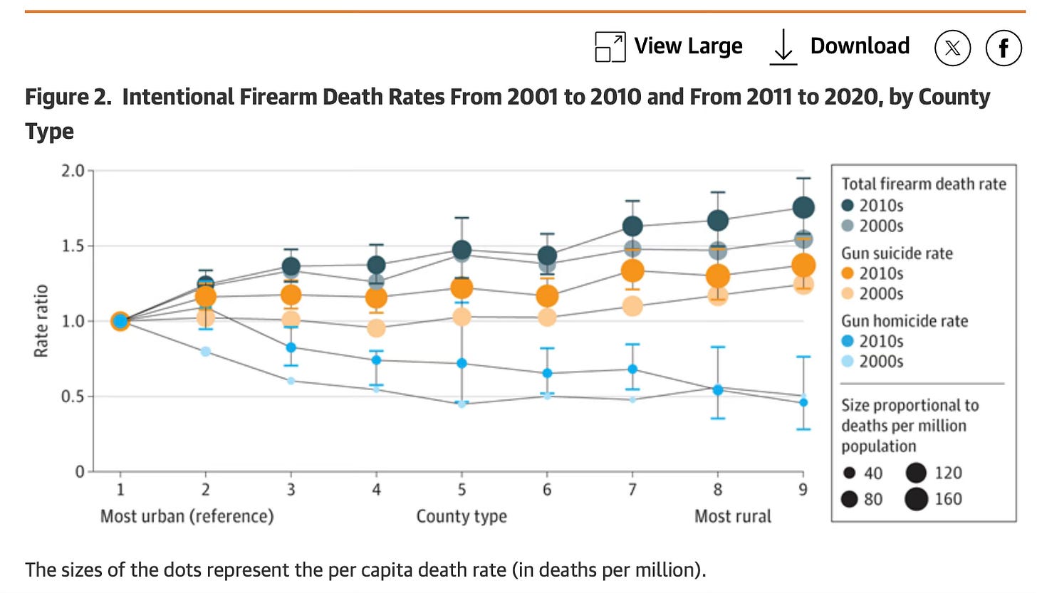 “Between 2011 and 2020…The most rural counties had a 76% (95% CI, 58%-95%) higher gun suicide death rate and a 46% (95% CI, 28%-76%) lower gun homicide death rate compared to the most urban counties.” (my emphasis)